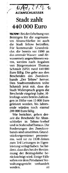 MAZ vom 27.09.11 - "Stadt zahlt 440.000 Euro"
