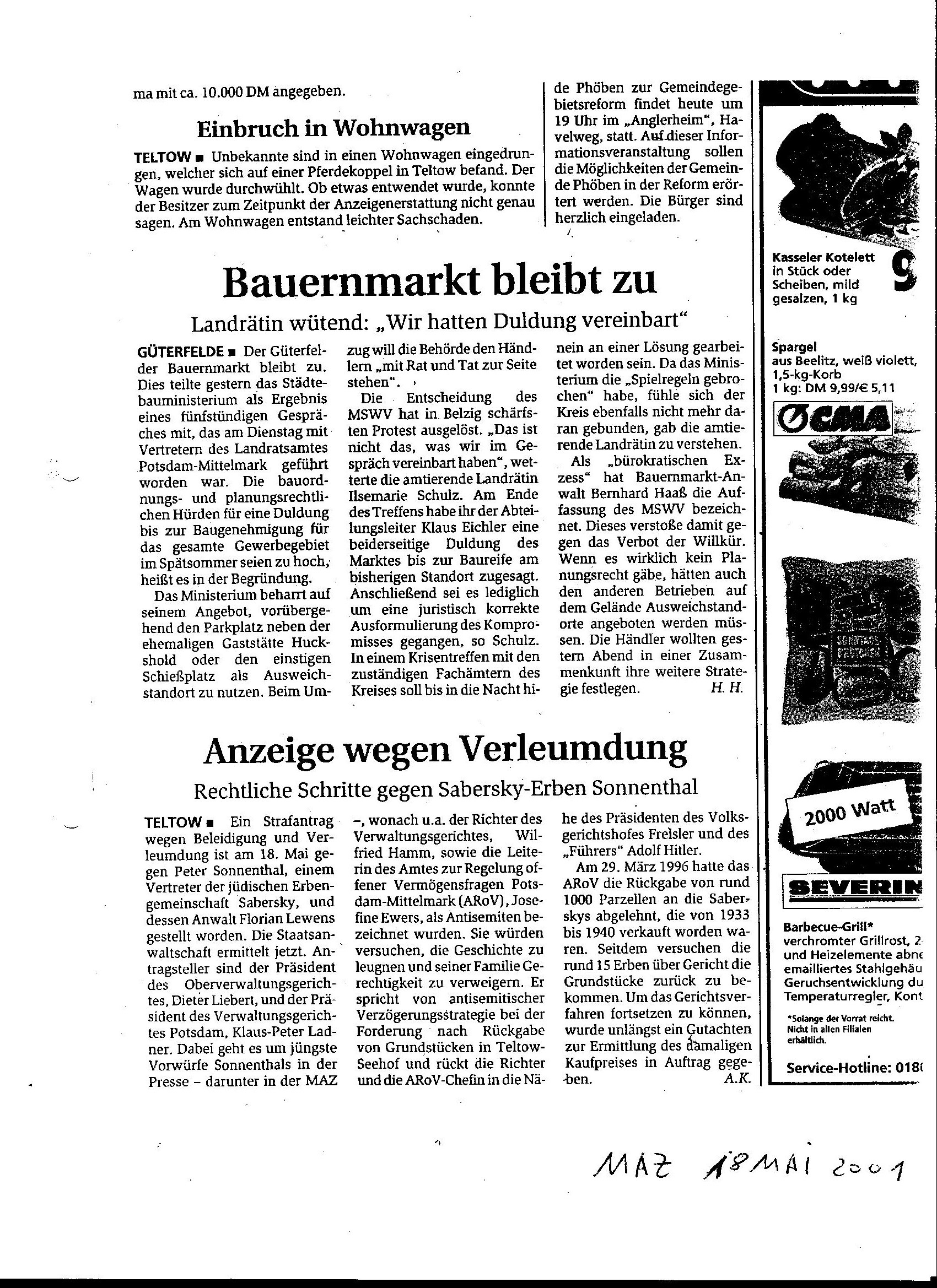 Märkische Allgemeine vom 18.05.2001 Rechtliche Schritte gegen Sabersky-Erben Sonnenthal